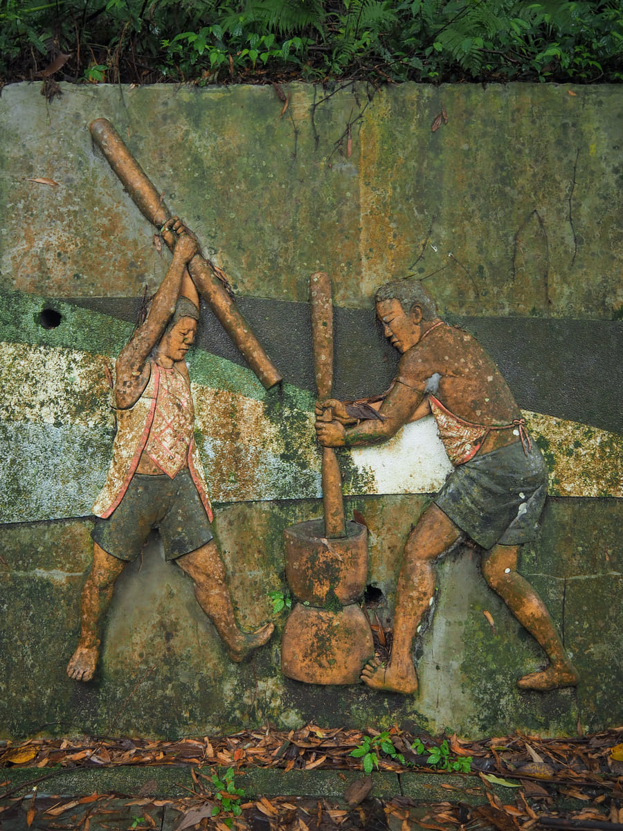 沿途的牆面裝飾著描繪泰雅族傳統生活場景的藝術作品。