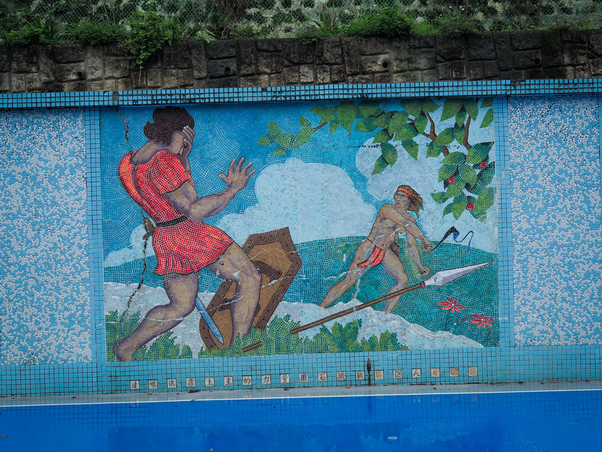階梯會經過教堂的籃球場,球場上裝飾著描繪聖經故事和泰雅文化的馬賽克藝術作品。這些藝術創作出自丁松青神父(Father Barry Martinson)之手,他於1976年被派到清泉服務,沒想到一待就是數十年。