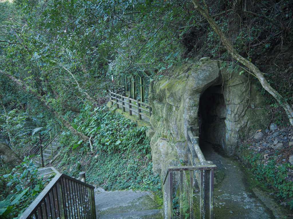 不久後,我來到小烏來風景區的後段。我從左側繩橋的出口閘門旁走過,接著抵達這個岔路口。環形路線繼續往左走下石階,但在此之前,不妨先穿過右側那條小型仿隧道,前往瀑布觀景台,很值得繞進去看看。