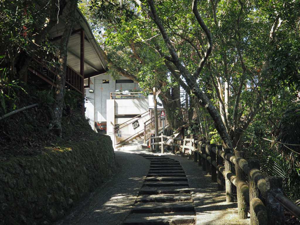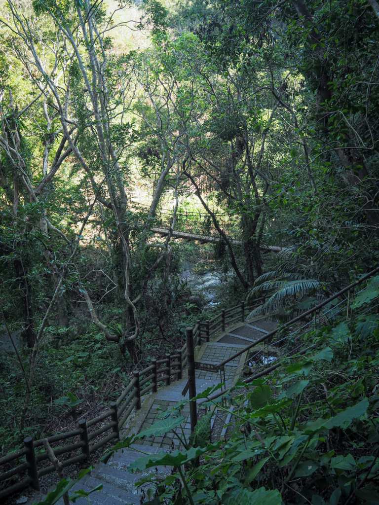一條綠意盎然、兩側竹林夾道的小徑繞過溫泉區側邊,接上一段往河邊延伸的石階。