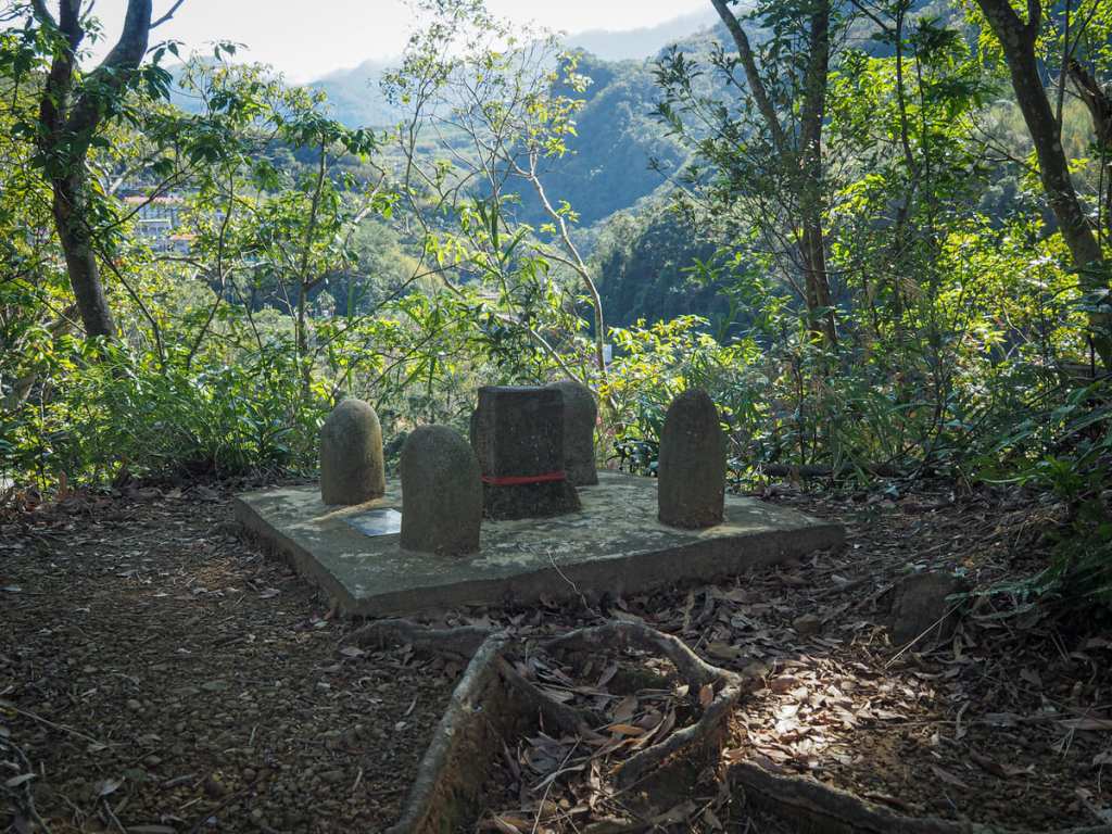 我選擇直行往下(路標指向瀑布底部),但出發前先繞道去了小烏來山的山頂。基點就在涼亭上方的步道旁。山頂隱約可見雲霧繚繞的遠山,但視野大半被樹木遮擋。