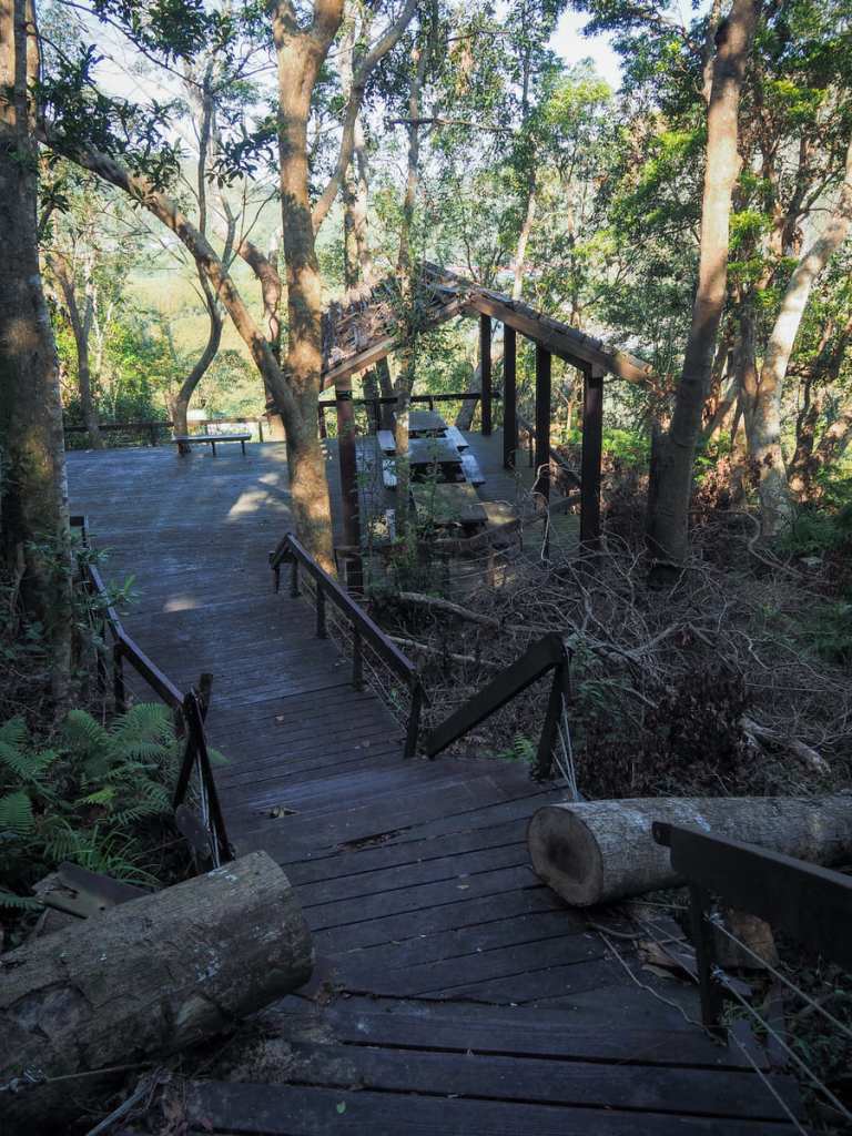 步道下切至木棧觀景台之前,有一棵樹橫倒在路中央。樹幹已被鋸開讓山友得以通行,但旁邊的欄杆卻沒有修復。我覺得這某種程度上挺能代表這一帶的整體維護狀況——只做了維持步道堪用的最低限度。感覺小烏來以前曾是熱門的觀光景點,如今卻彷彿慢慢被人淡忘了。