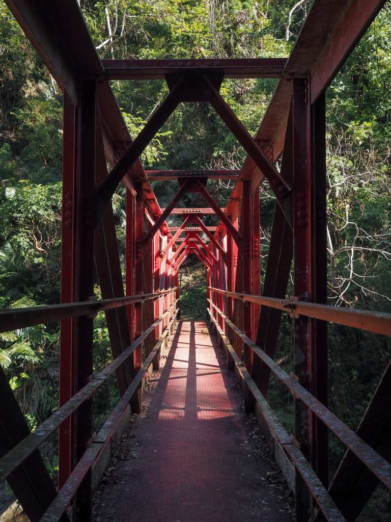經過一段極為陡峭的下坡後,步道抵達雲內溪,並由一座紅色鐵橋跨越。低頭望去,溪水清澈見底,成群銀色的魚兒在其中悠游。不過,有下就有上……