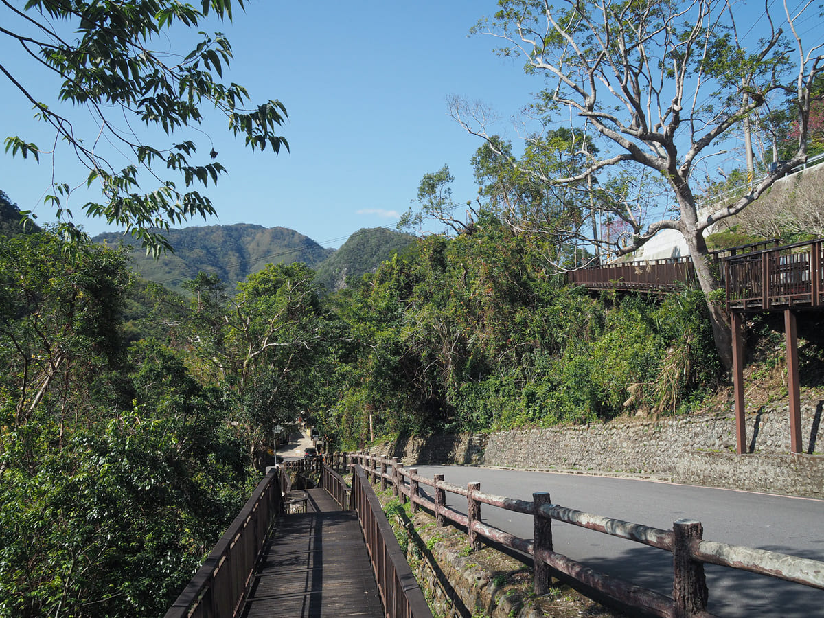 步道經過幾間小餐廳,旁邊有幾隻憨態可掬、卻被掛了一身配飾的小狗。接著會來到一道描繪泰雅族故事的彩繪牆,其中包括泰雅族人從岩石中誕生的傳說,以及他們如何在看見一隻大蒼蠅(被視為族靈)在女子下體來回飛舞後,才學會繁衍後代的故事。
