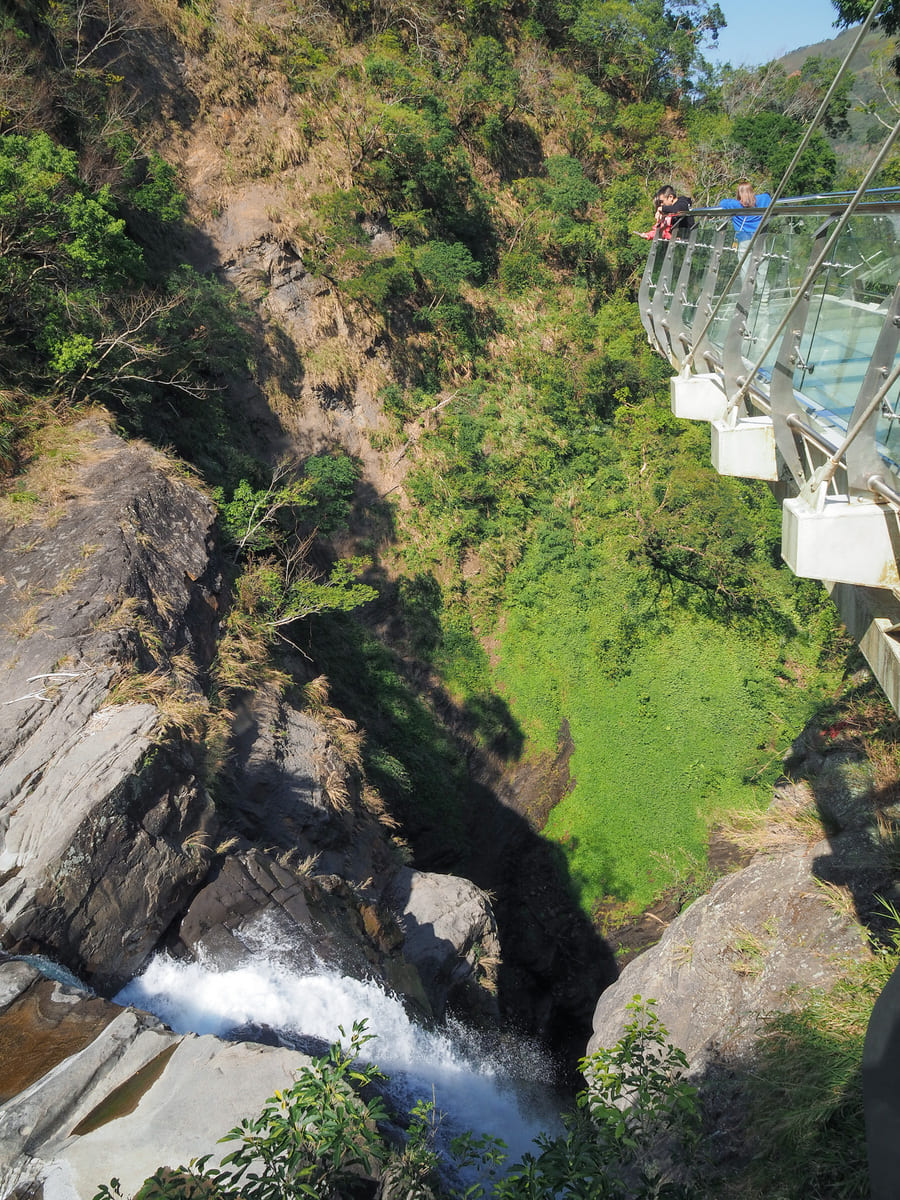 過了風動石,我很快便踏上了玻璃底天空步道。步道提供了俯瞰小瀑布的絕佳視角——那道小瀑布就在氣勢更為磅礴的主瀑布上游不遠處的水潭傾洩而入。若你有這個膽量,不妨低頭透過強化玻璃地板,看著水流從懸崖邊緣飛瀉約50公尺,激起漫天白色水霧。