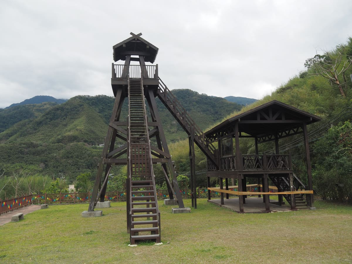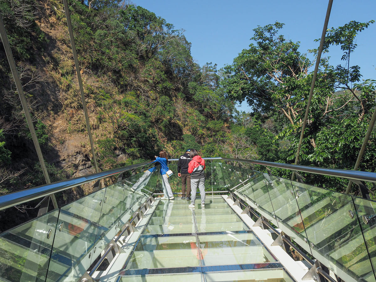 從售票亭沿一小段步道即可抵達天空步道。途中會經過一塊名為「風動石」的巨岩,高約五公尺,過去曾以極為細窄的底部支點,危危顫顫地矗立在河岸邊。它歷經無數颱風與地震而屹立不搖,逐漸與當地部落的傳說融為一體。族人相信,這塊巨石是一隻占卜之鳥所放置,用以保護部落農田不被豪雨沖毀——這個任務它顯然稱職地完成了許多年。然而,2013年蘇力颱風來襲,短時間內降下大量豪雨,這塊巨石終於從原本的位置被沖入水中。