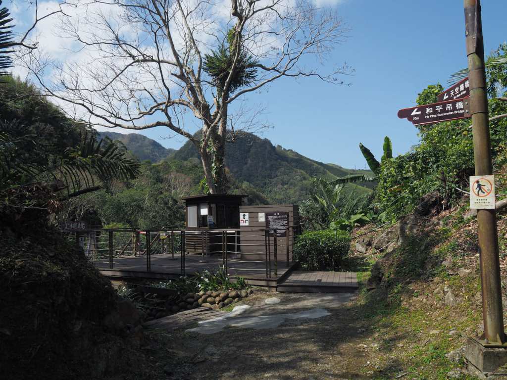 繩橋入口就在附近。若未購票,可走下方那座較小的橋跨越溪水,原路返回羅浮;若已購票,向橋旁的工作人員出示票券即可通行。