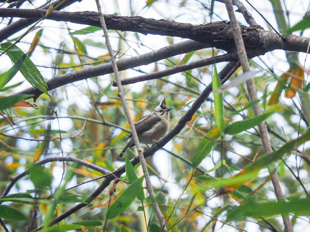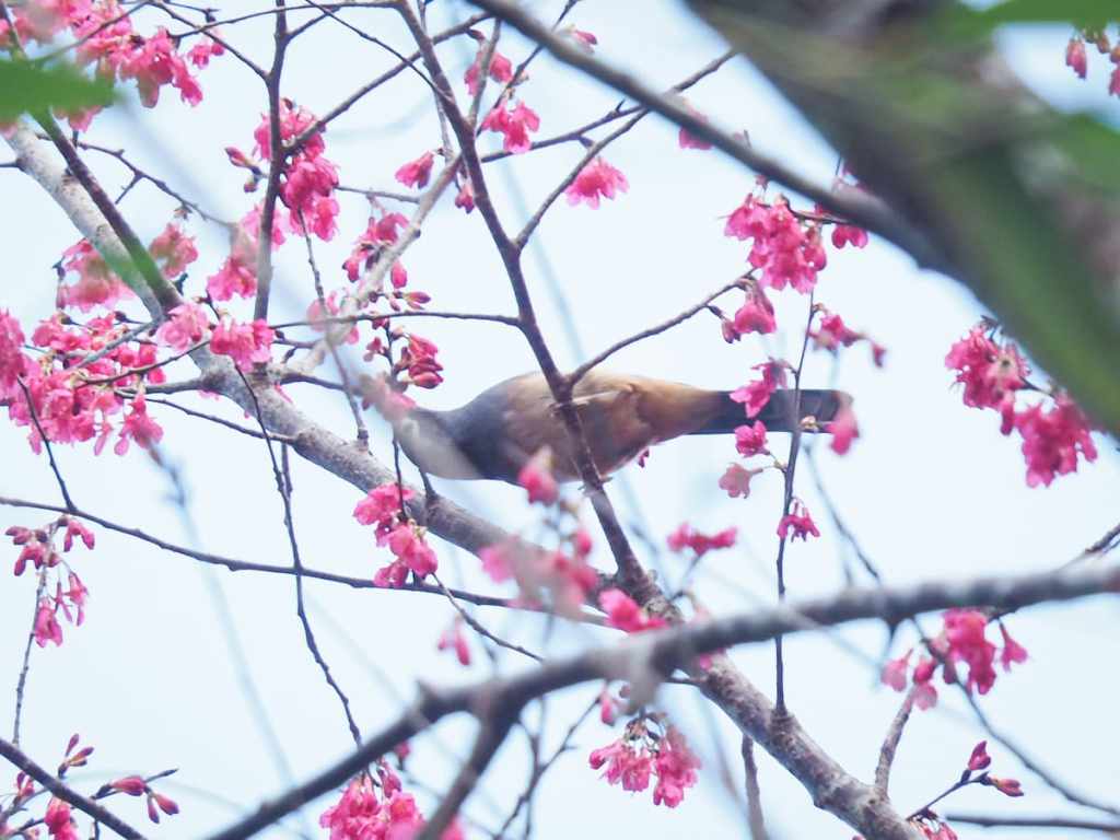 我造訪時正值二月中旬,山櫻花仍在盛開。路旁一棵樹上聚集了一大群冠羽畫眉,以及數隻白耳畫眉。