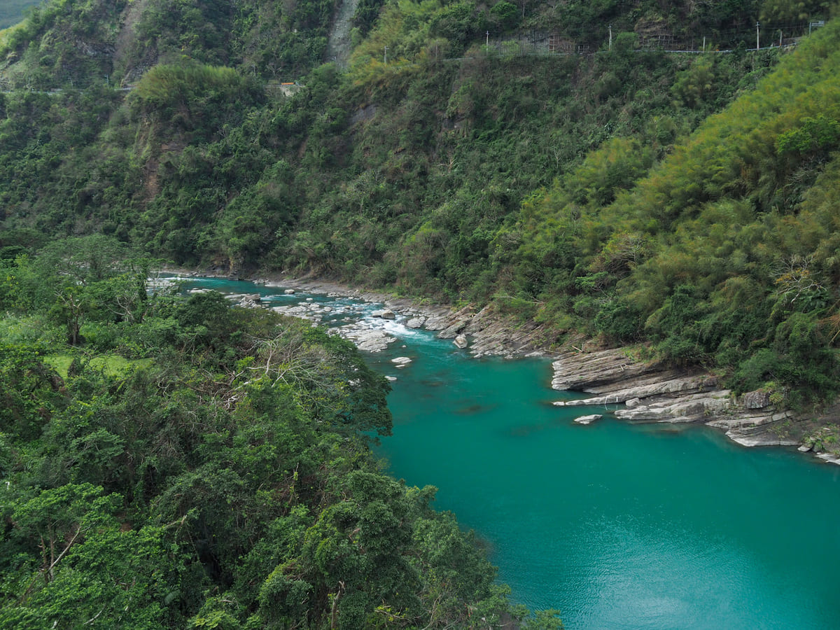 我不確定是否與大漢溪水中的礦物質成分有關,又或許只是那天天氣特別好,橋下的溪水呈現出一種極為鮮豔的藍色。