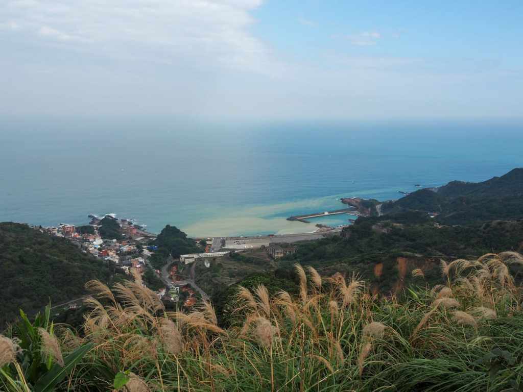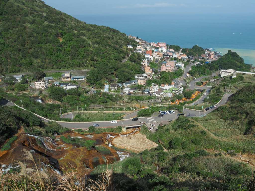 Looking down towards to coast from the lookout platform, the yellow-tinged mineral-rich flow from Jiufen Creek spreads out, mixing with the waters of Liandong Bay (濂洞灣).