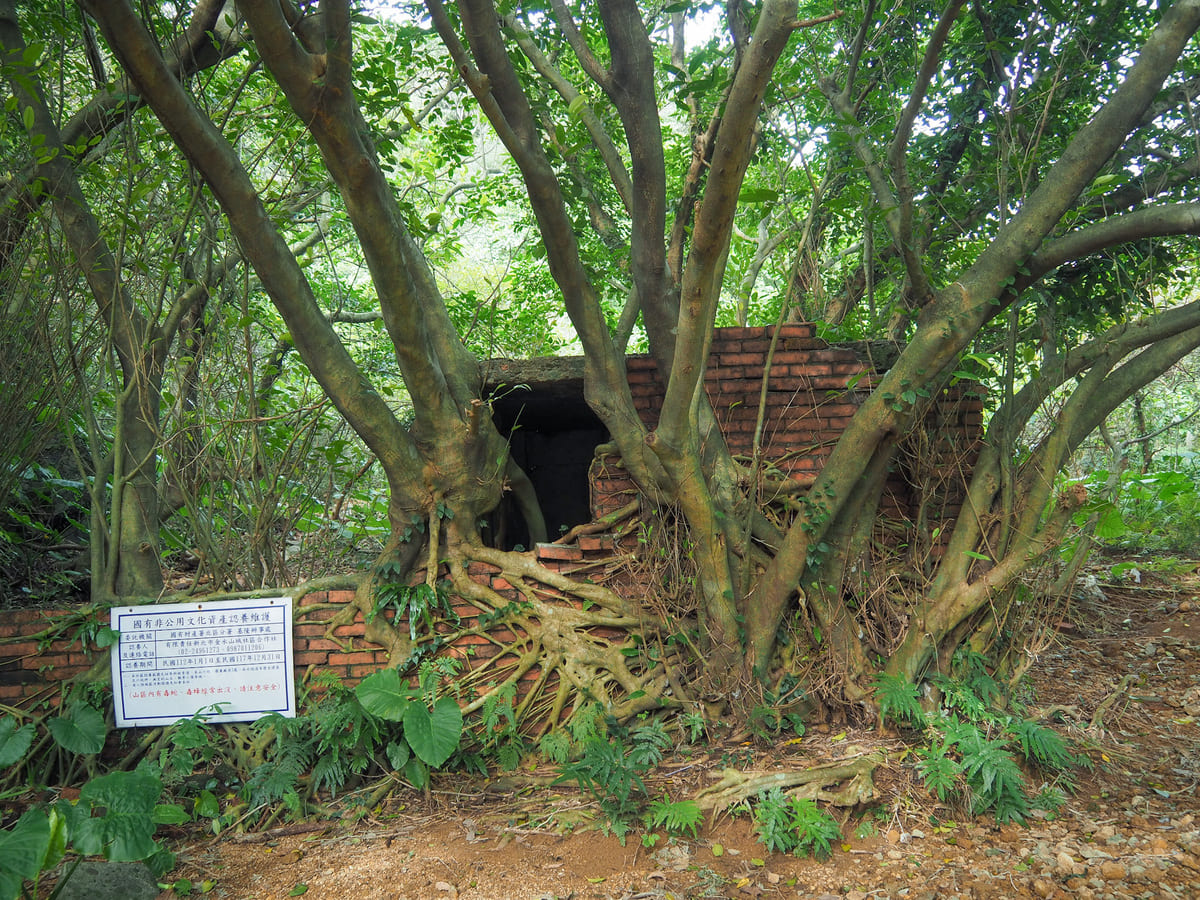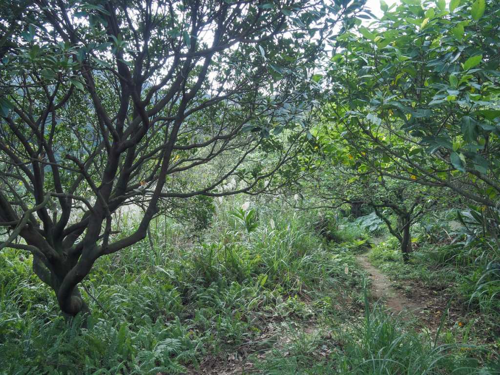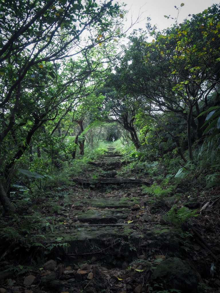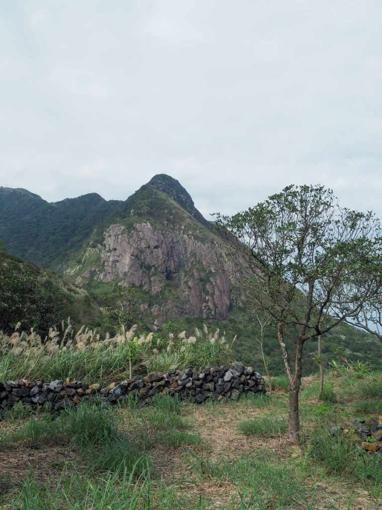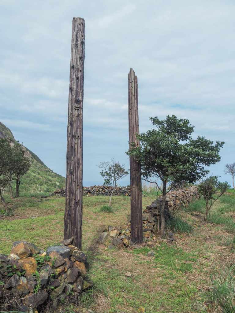 The trail climbs to a parcel of flat land bounded by stone walls. Trees have begun encroaching on the clear ground and on one edge, two wooden posts form a doorway of sorts. This location was featured in the 1992 Taiwanese drama, Hill of No Return (無言的山丘).