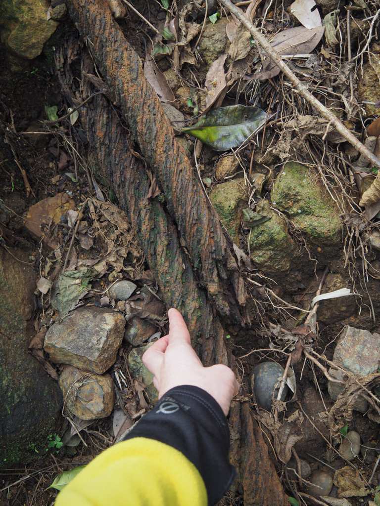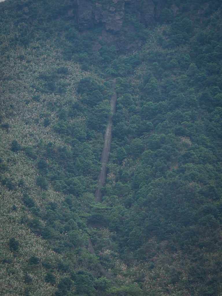 After a brief but steep climb, the trail crests a rise and from up here, you can see across a valley to where one of the old flues teeters on the verge of collapsing — indeed, part of it has already collapsed. These giant concrete snakes (there are at least three of them) are huge. Tall enough to walk through, they run from the old Shuinandong copper smelting plant (now known as the remains of the thirteen levels), all the way up towards the spine of Stegosaurus Ridge (although I’ve never looked into precisely where it is that they terminate). They were built to carry the toxic fumes from the smelter up onto the hills and away from the workers, and even though they’ve been defunct for decades, the concrete still contains high levels of toxic substances (at least that’s one of the reasons the authorities give to explain why they’re off-limits).