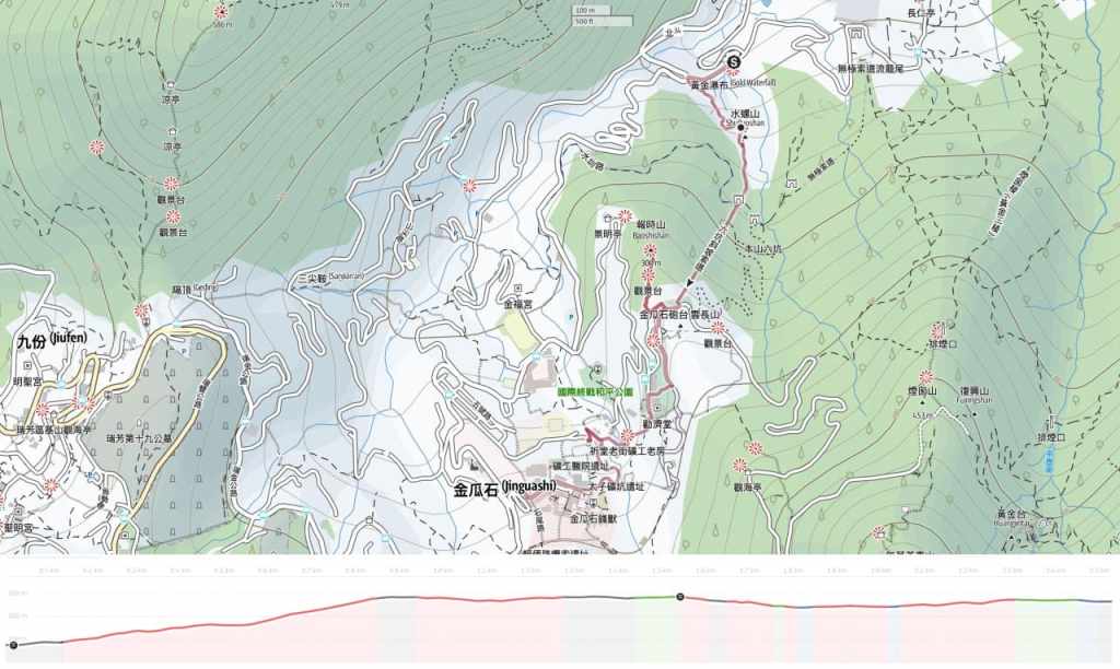 I have given much shoe rubber to the hills of New Taipei’s Ruifang District and I’m still not even close to running out of tracks to walk. This particular mini adventure is a brief but enjoyable walk that connects two of the area’s popular sight-seeing spots: the Golden Waterfall and Shibaoshan Lookout. If you’re feeling energetic, you could use it as a warm-up for climbing Teapot Mountain, or if — like me — your in more of a leisurely mood, you can end the walk with a pleasant sit down in one of Jinguashi’s coffee shops.
