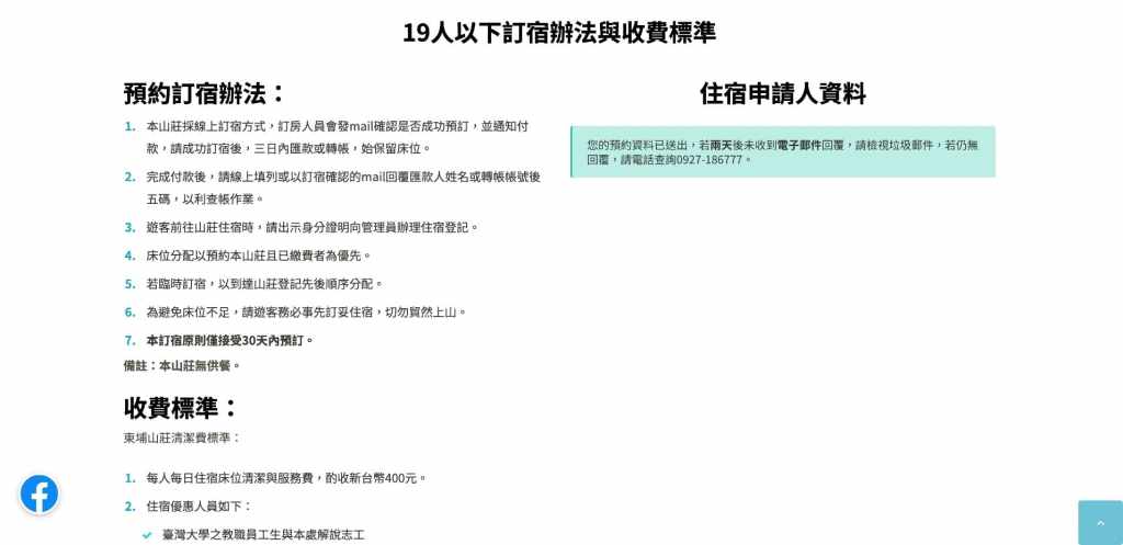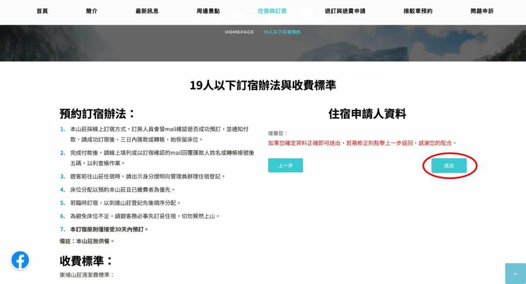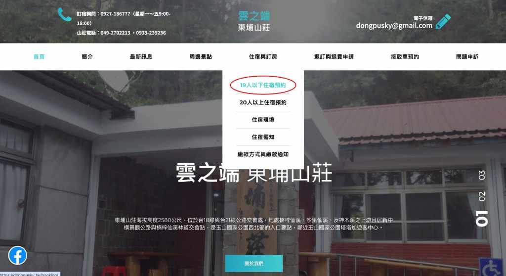 Head to the Dongpu Lodge website and select “住宿與訂房” to see the accommodation and reservations drop-down menu. If your group has fewer than 19 people, you’ll need to choose the first item on this menu “19人以下住宿預約”. (The second item is for groups of more than 20.)