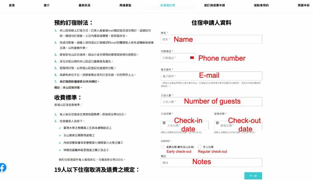Fill out the basic information form. You don’t need to input the name of each group member, just the name of the person who is booking. If you’re attempting a one-day ascent of Jade Mountain, you will need to select the “early check-out option”.