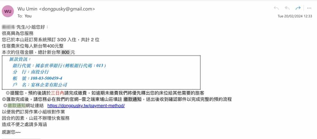 When the confirmation email comes, it will ask you to pay the booking fee via bank transfer. This payment method only works if you have a Taiwan bank account. If you’re coming from abroad and don’t have a Taiwanese account, just send them an email explaining the situation and you’ll be able to pay when you arrive. (If you apply using a foreign name, there’s a high chance they won’t even bother sending you the transfer information.)
