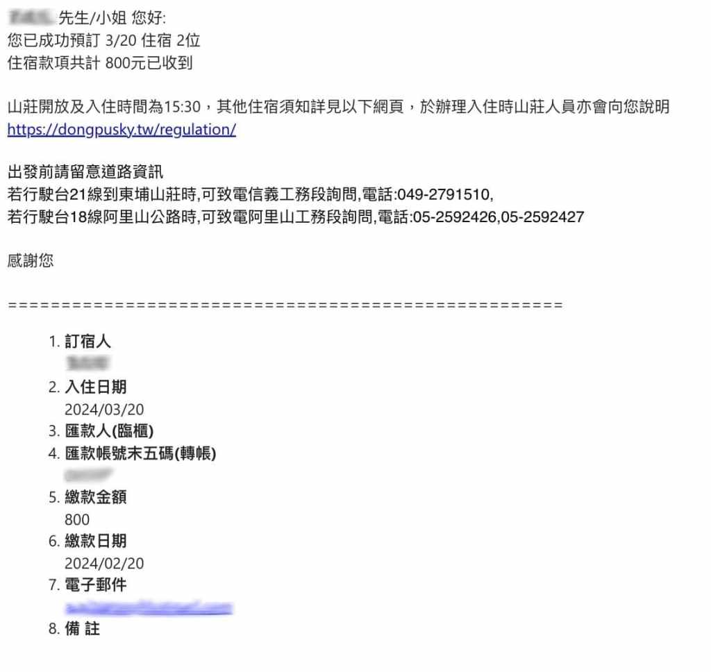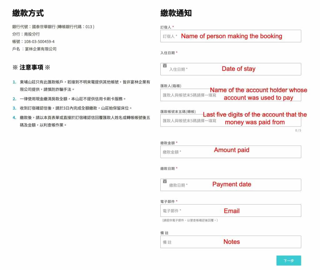 If you are able to complete the bank transfer, you need to let the lodge know that you’ve done so. You can do this by heading to https://dongpusky.tw/payment-method/ and filling out the above information.