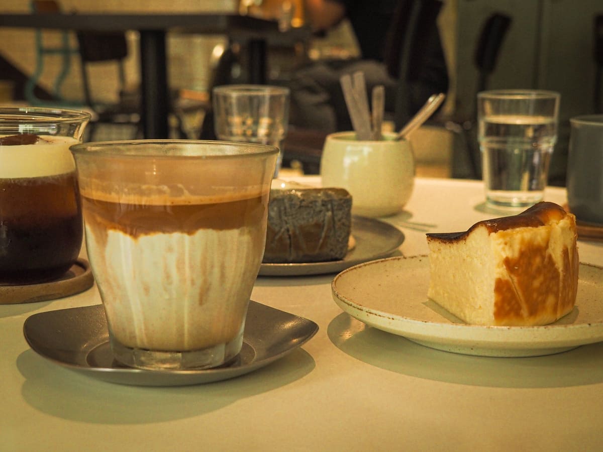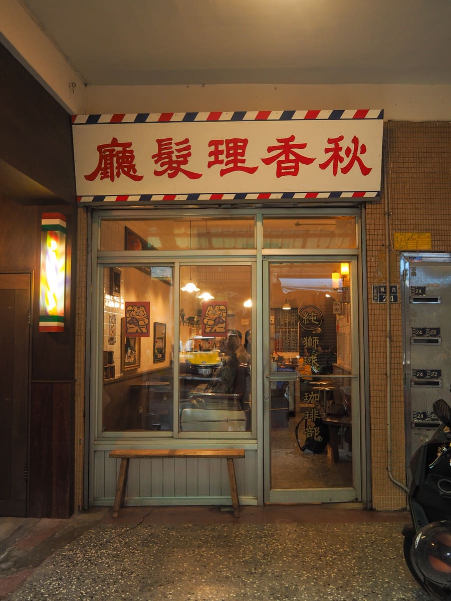Hidden away in a residential area that’s closer to Sankeng TRA station than downtown Keelung, this coffee shop really leans into its barbershop heritage. A rotating blue, red, and white pole lights up the exterior, while inside, two genuine vintage barber chairs have been left in situ and are now serving a second life as odd chairs (more photogenic than genuinely practical when it comes to sharing cake). A couple of bench seats in the front room and several straw zafu cushions arranged around low tables in the back room. In terms of the menu, I was immediately drawn to the 1+1 (espresso with a small latte) and the pistachio Basque cheesecake. A few of the other interesting items include the espresso con panna (espresso topped with cream), the tea cappuccino, and the sesame mochi Basque cheesecake.