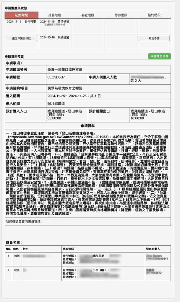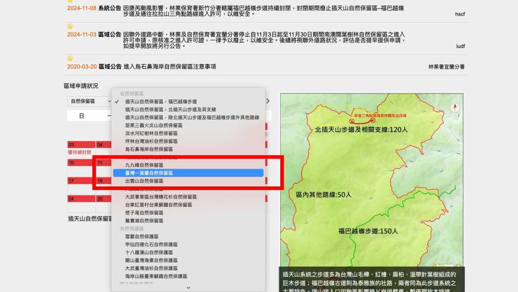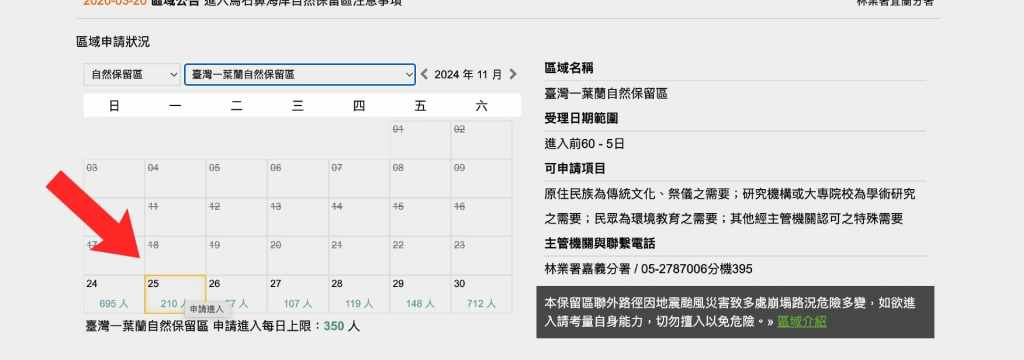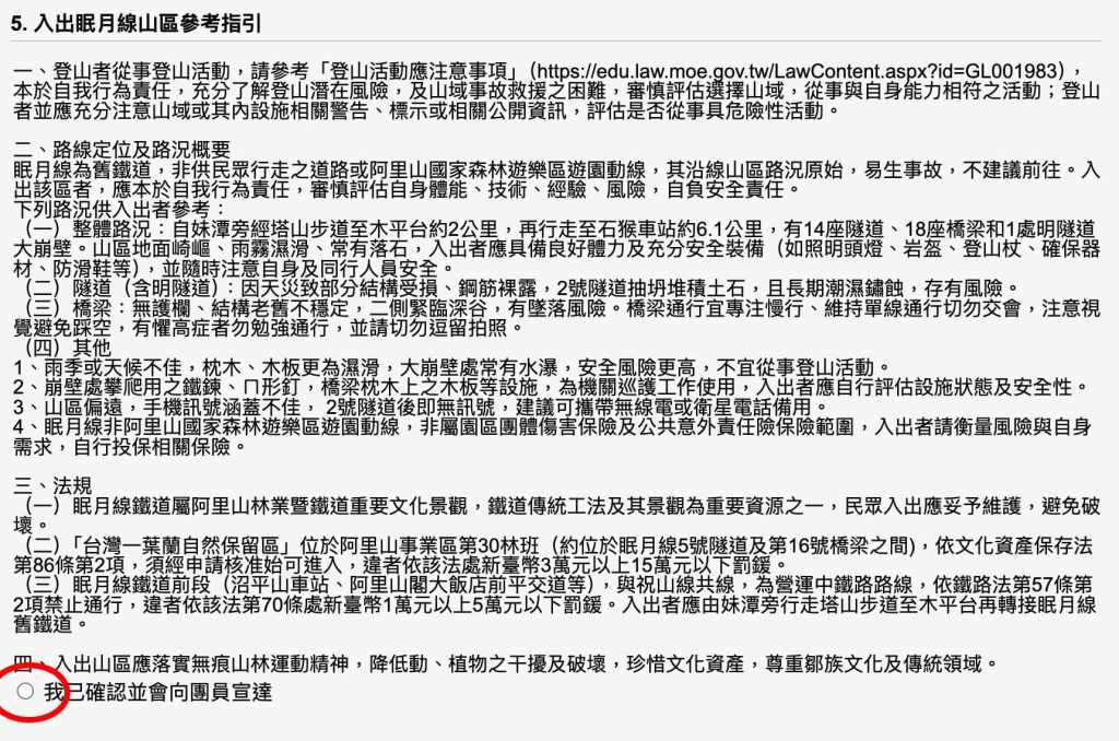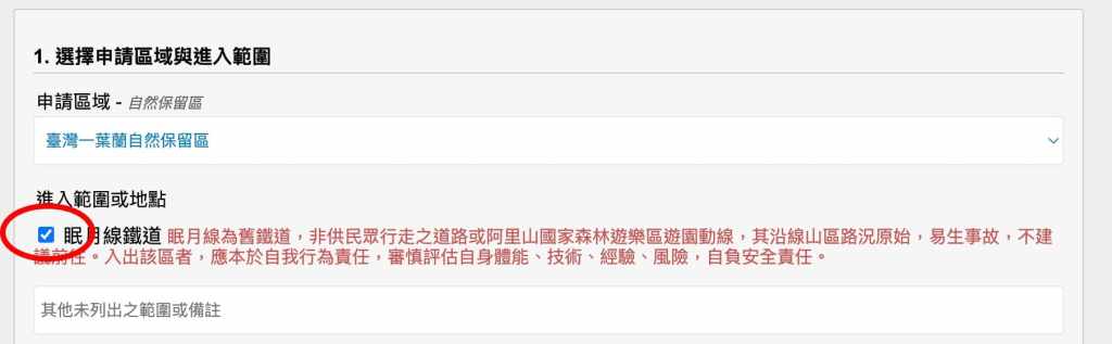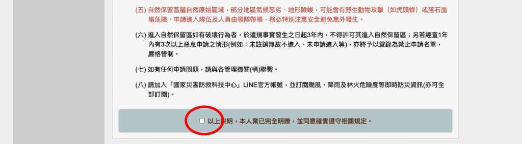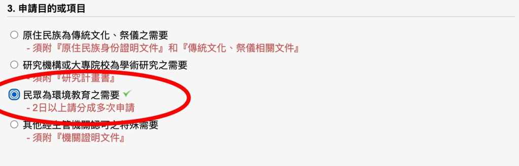 Since the site is a nature reserve, you’re asked to select your reason for visiting. Hikers need to choose the third option “民眾環境教育之需要”. (This is something like “nature education for members of the public”.)