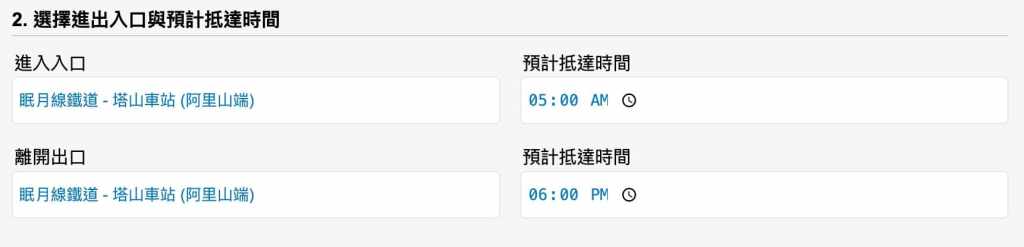 Choose the trailhead that you will enter and exit through. The standard one-day walk involves entering and exiting via Alishan National Forest Recreation Area by the ruins of Tashan Station, so you’ll need to select “眠月線鐵道 – 塔山車站”.