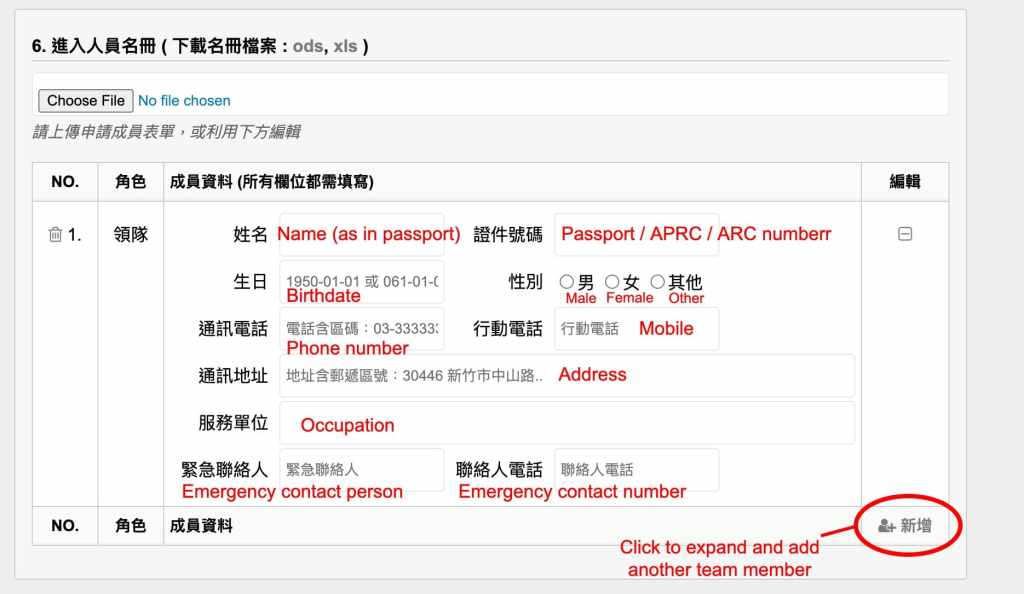 Fill out the information of your group members. The first person listed is the group leader. To add any additional teammates, just click the person icon at the bottom right of the form. You must fill in both phone number spaces, but if you don’t have a landline to use, you can use your mobile number twice. It is possible to put a foreign person and phone number as the emergency contact.