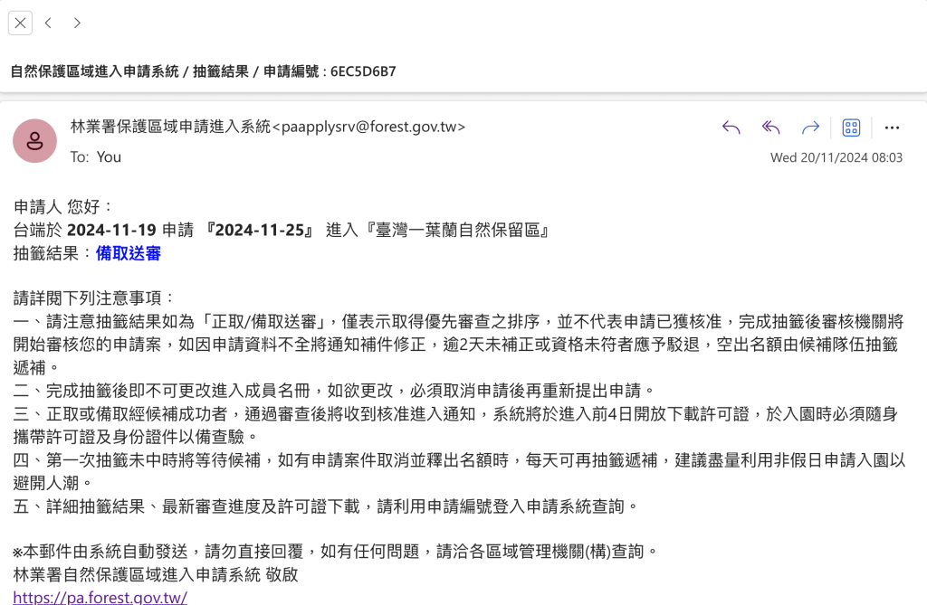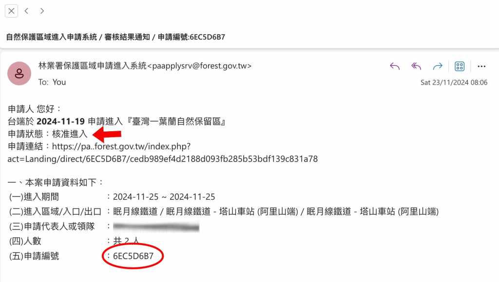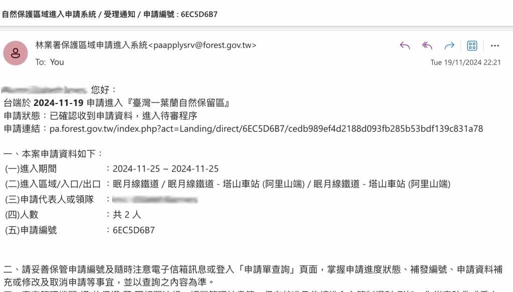 The third and final email showed that the status of our application had been changed to “核准進入” meaning that it had been approved. This email arrived four days after I applied and just two days before we were set to hike. However, I believe that if you apply further in advance than we did, you will know your outcome sooner.