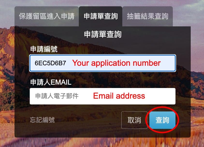 Head back to the Forestry and Nature Conservation Agency website and login using your application code and email address.