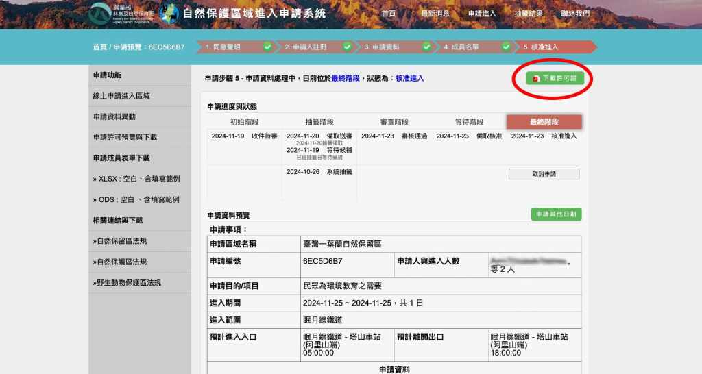 Click “下載許可證” to download a PDF copy of your permit. You’ll need to print this out and bring it with you to post in the permit box along the trail.
