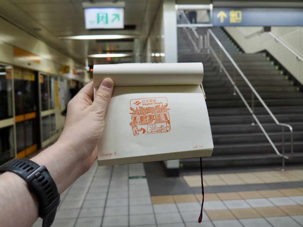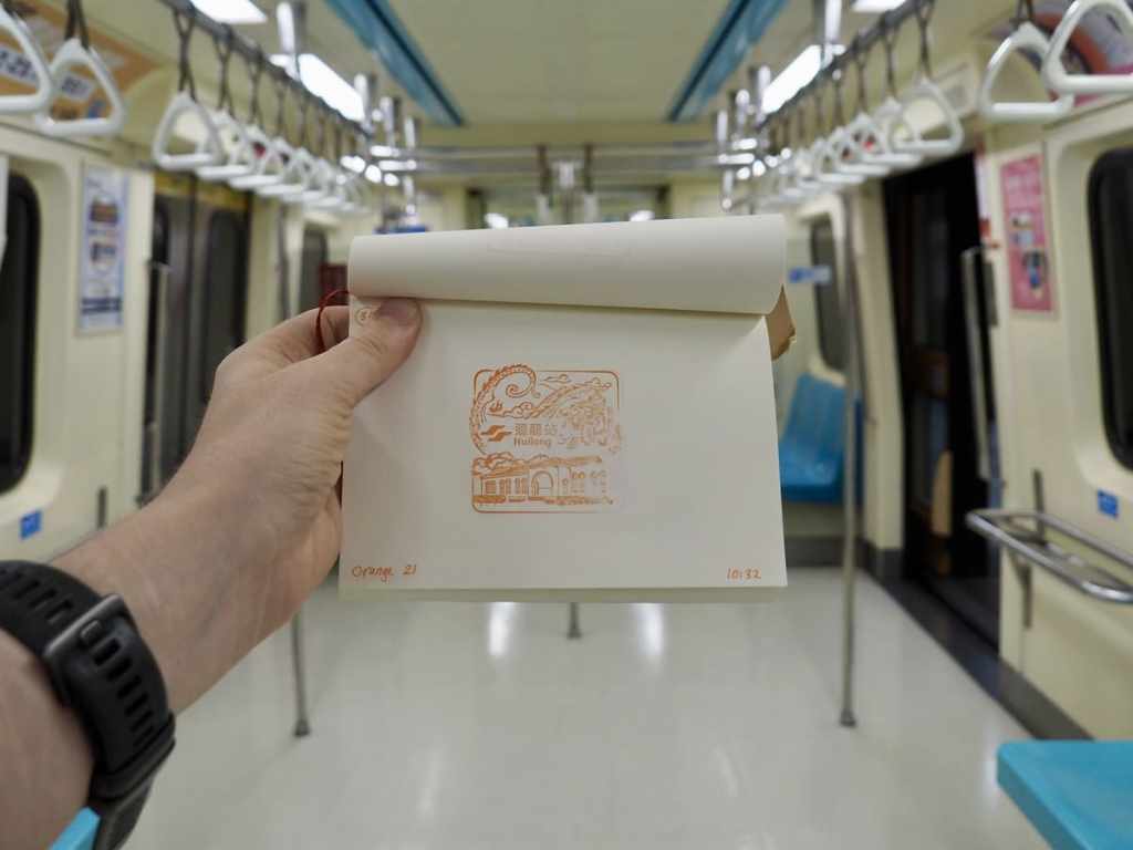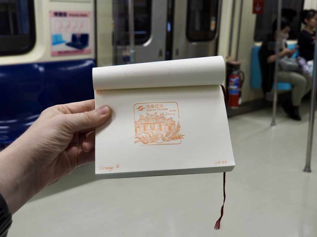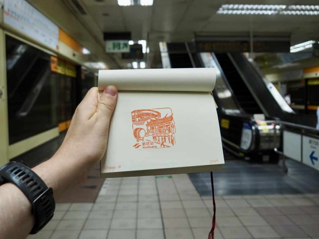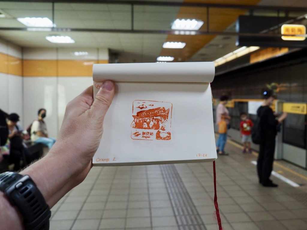 Stamp description: The Zhonghe-Xinlu Line’s commemorative stamps are rendered in orange ink and are square (except for transfer stations, which are black and shaped like a spiky text bubble).