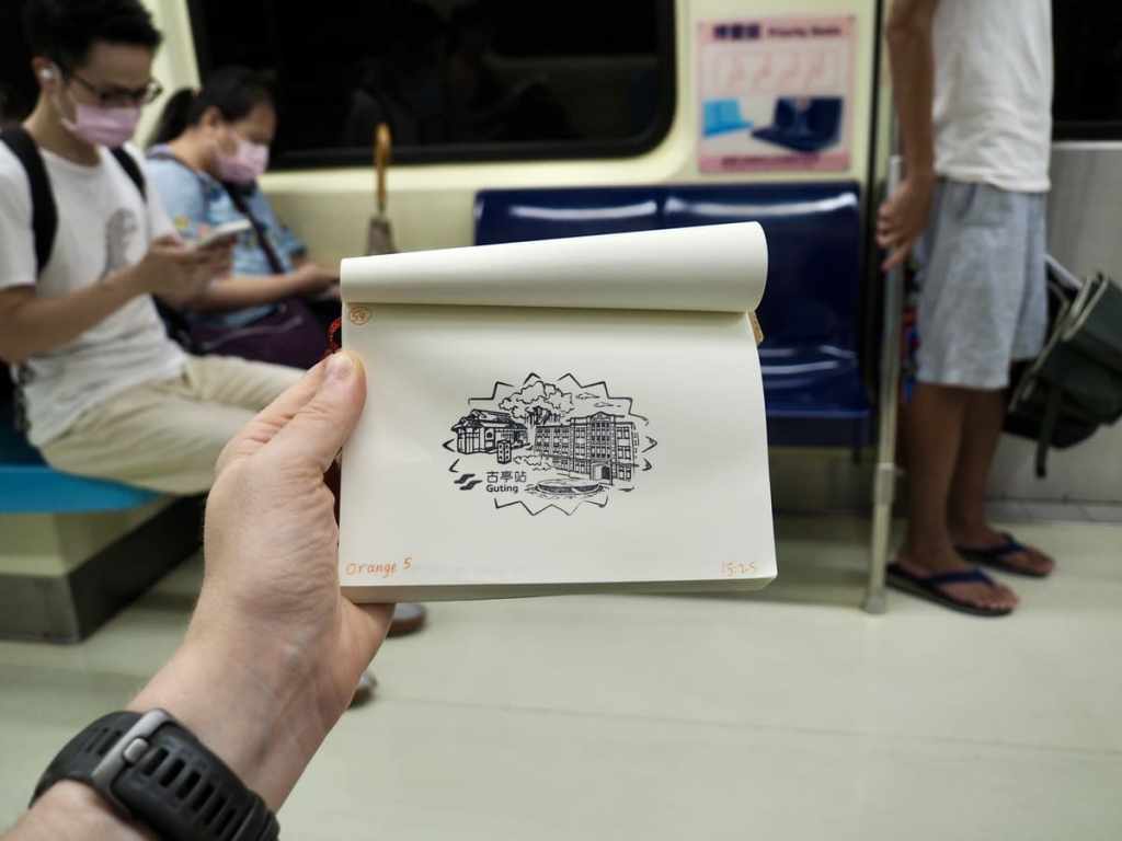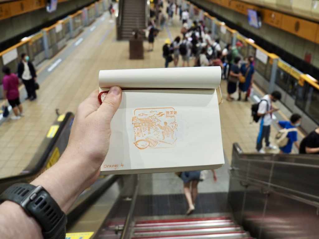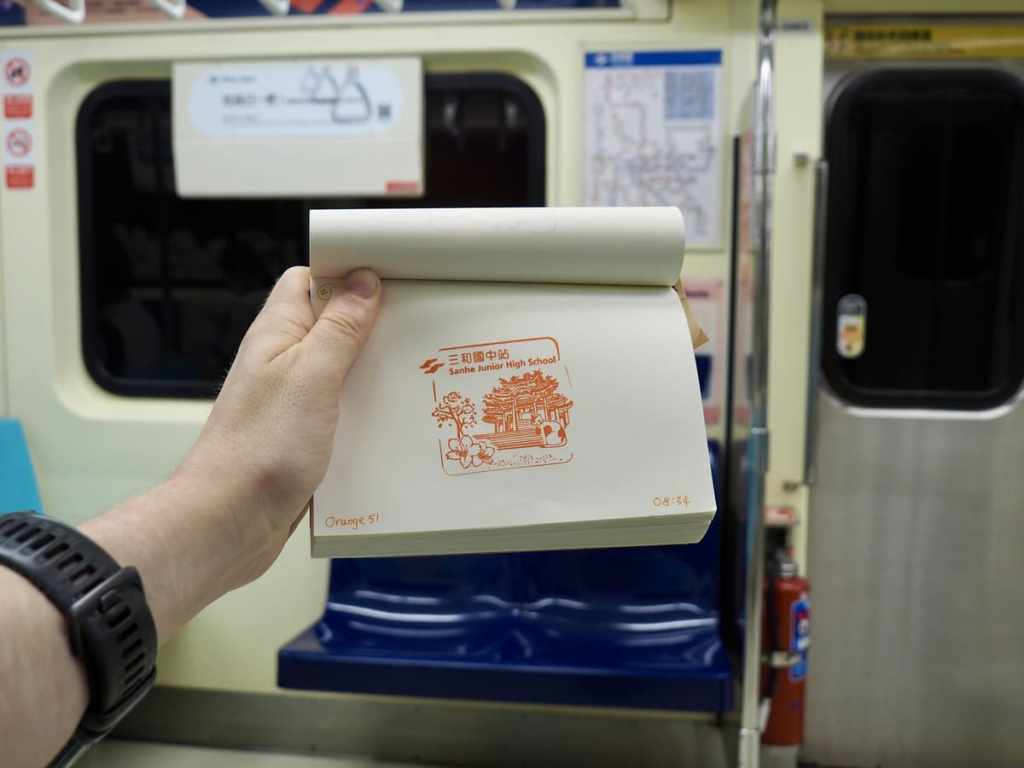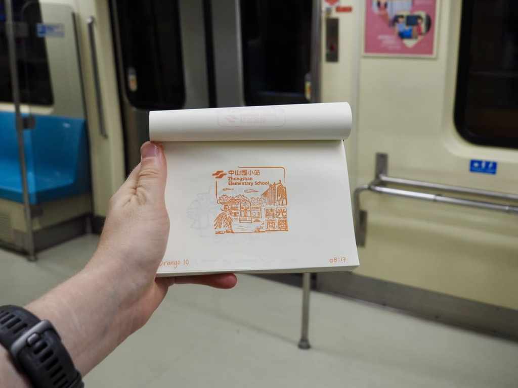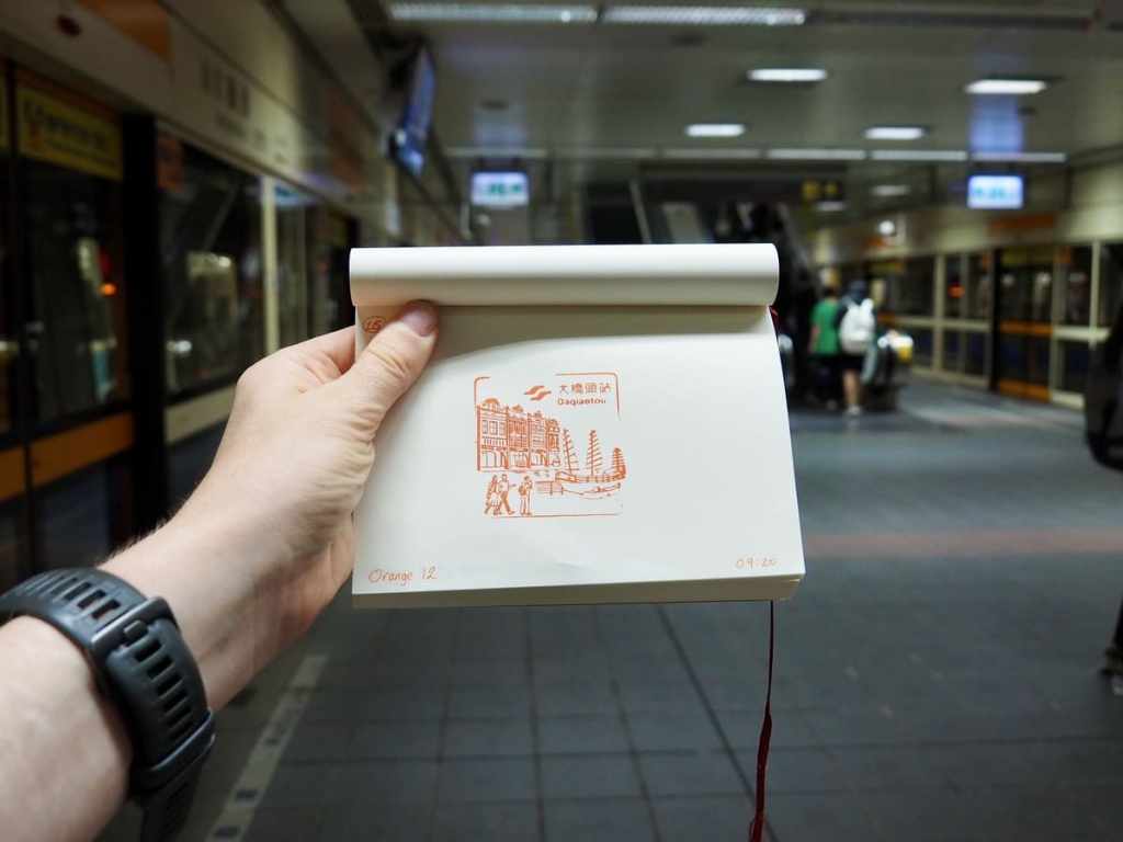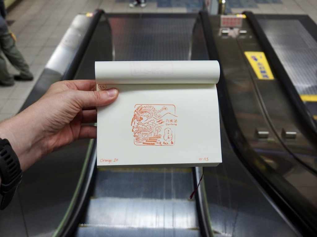 Stamp description: The Zhonghe-Xinlu Line’s commemorative stamps are rendered in orange ink and are square (except for transfer stations, which are black and shaped like a spiky text bubble).