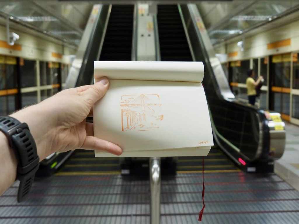 The stamp shows a pair of stylish shoppers looking at beautiful dresses on the area’s wedding dress street. Behind them are the pyramid peaks of the MRT station.